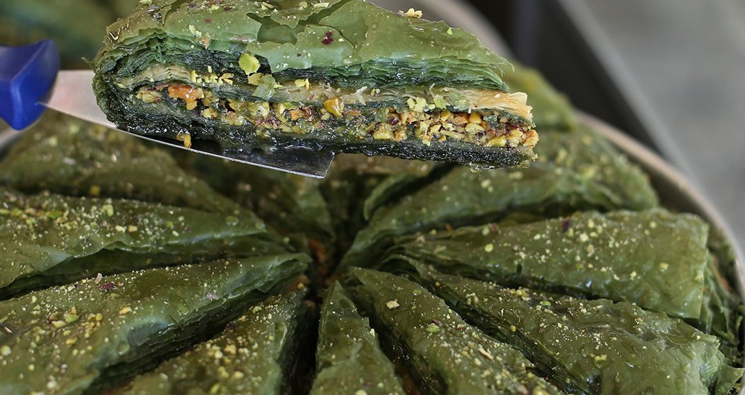 Πρόκειται για τον μπακλαβά pistachio ο οποίος φτιάχνεται με πλούσιο, τραγανό φύλλο κρούστας με γεύση pistachio μαζί με χοντροκομμένα φιστίκια Αιγίνης και μπόλικο σιρόπι.