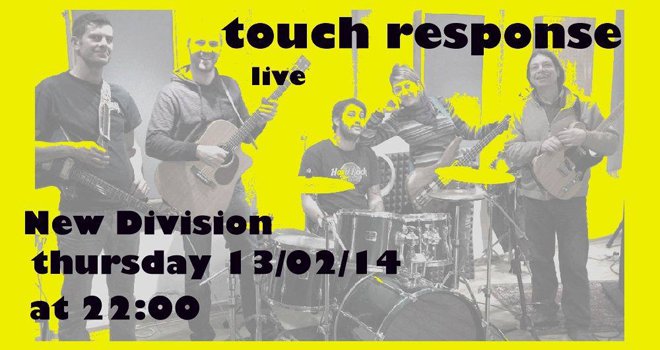 Με Reggae και Ska ήχους και τόνους, επιστρέφουν οι Touch Response για τις νέες ζωντανές μουσικές τους εμφανίσεις. Αυτή τη φορά θα τους βρείτε δίπλα από την ζεστασιά του τζακιού στην “New Division”. Το ρεπερτόριο αποτελείται από διασκευές και δικές τους μελωδίες που δίνουν μορφή σε θεαματικές βραδιές, γλεντώντας, χορεύοντας, απολαμβάνοντας! Οι Touch Response: Στέφανος Ιωαννίδης (φωνή, ακουστική κιθάρα), Αφροδίτη Νικολάου (ηλ. μπάσο), Στέλιος Φράγκος (lead κιθάρα), Βασίλης Πάλαμας (ρυθμική κιθάρα, φυσαρμόνικα) και Φρίξος Πρωτόπαπας (ντράμς, κρουστά).