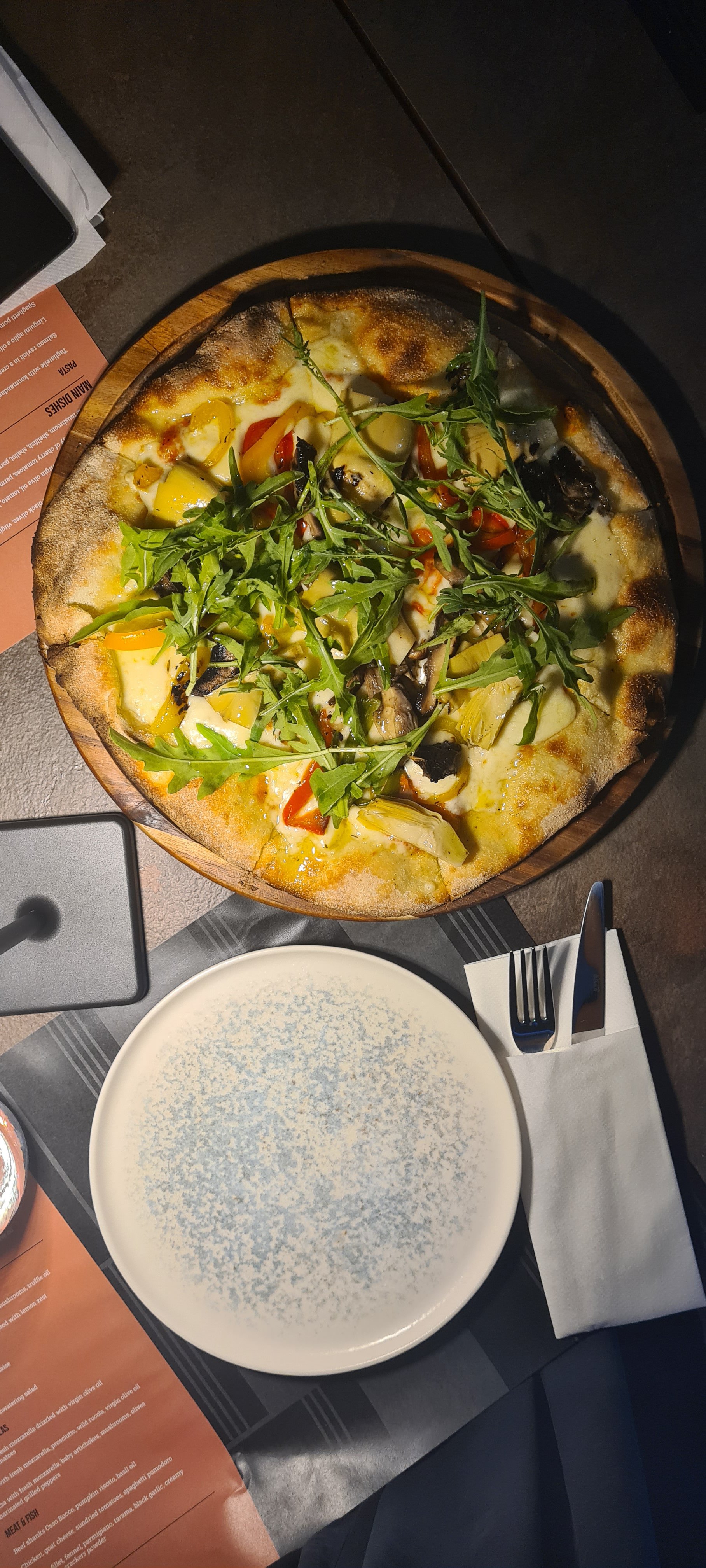Εμείς ξεκινήσαμε απολαμβάνοντας μια ποικιλία από ιταλικά ψωμάκια τα οποία έφτασαν με μαύρες ελιές και ελαιόλαδο, ενώ ακολούθησαν οι πολύ νόστιμες μπρουσκέτες με προσούτο, ντομάτα και βασιλικό. Ξεχωρίσαμε επίσης τις χειροποίητες πίτσες, οι οποίες φτιάχτηκαν επιτόπου, και μας ενθουσίασαν, όπως πολύ μας εντυπωσίασε και η διαδικασία παρασκευής τους που παρακολουθήσαμε από την open plan κουζίνα. Δοκιμάσαμε λοιπόν πίτσα με φρέσκια μοτσαρέλα, με προσούτο, μοτσαρέλα και ρόκα, και με φρέσκια μοτσαρέλα, μανιτάρια, αγκινάρες, ελιές και πιπεριές! Όλες πραγματικά πεντανόστιμες και λαχταριστές.