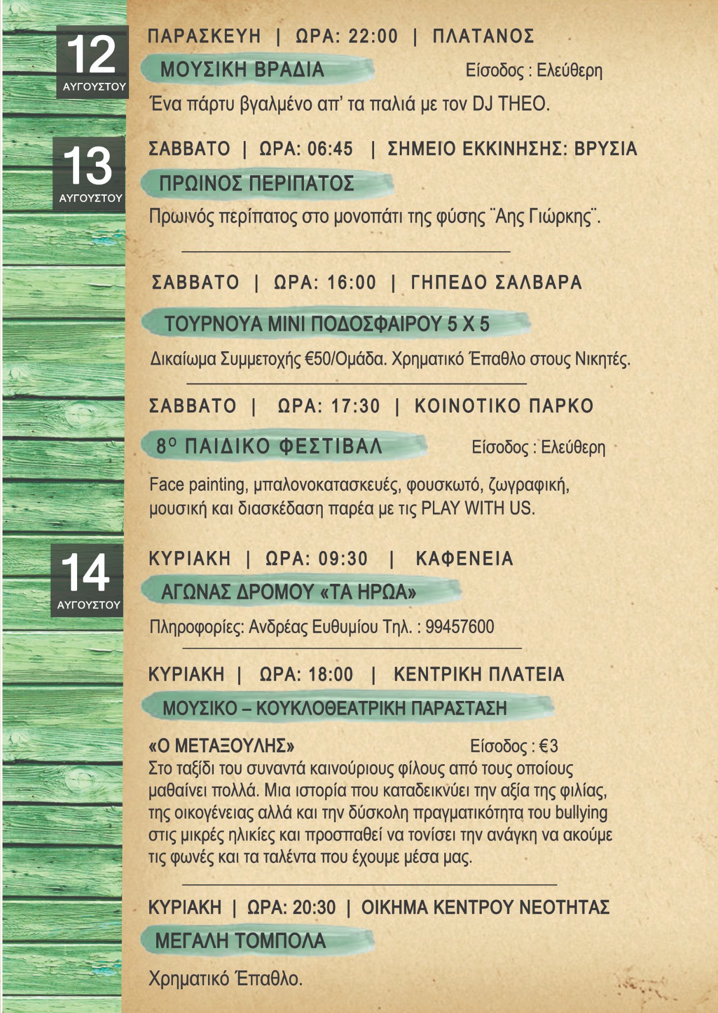 Το πρόγραμμα περιλαμβάνει μια σειρά από εκδηλώσεις, οι οποίες θα διαρκέσουν μέχρι τις 11 Σεπτεμβρίου, όπως summer pool party, το 4ο Φεστιβάλ γαστρονομίας, θεατρικές παραστάσεις για τα παιδιά, μουσική, χορό, τραγούδι με τον δημοφιλή Έλληνα καλλιτέχνη Γιώργο Τσαλίκη και τους μοναδικούς Droulias Brothers και τη Λίζα Θεοφάνους, φαγητό, πανηγύρι και ψυχαγωγία για όλους.