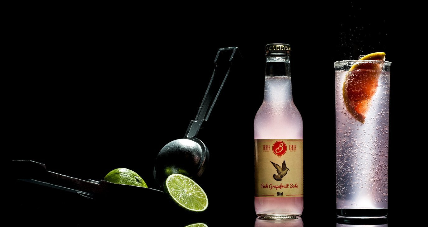 Απογεμίζουμε το κάθε ποτήρι με Three Cents Pink Grapefruit Soda.