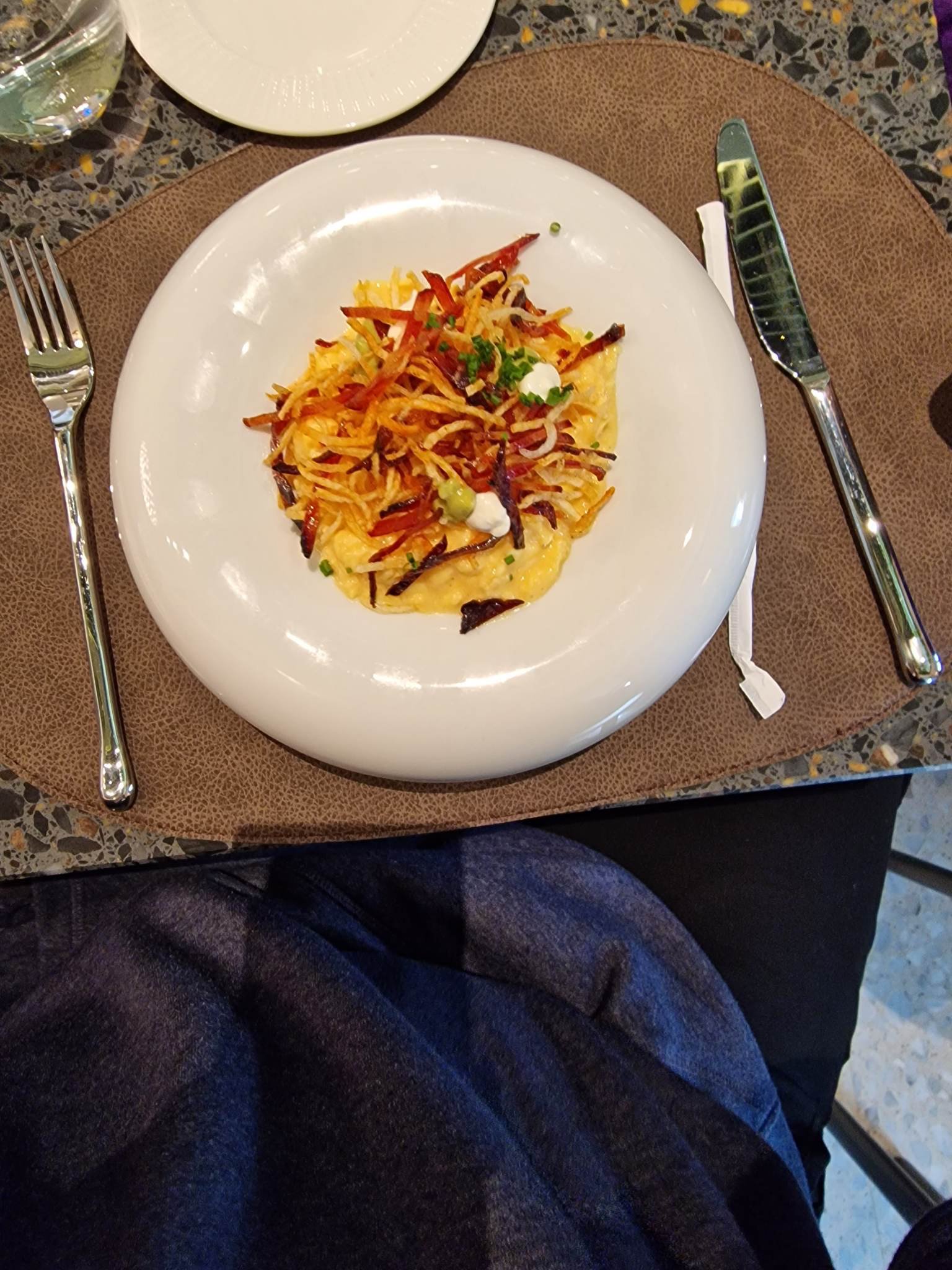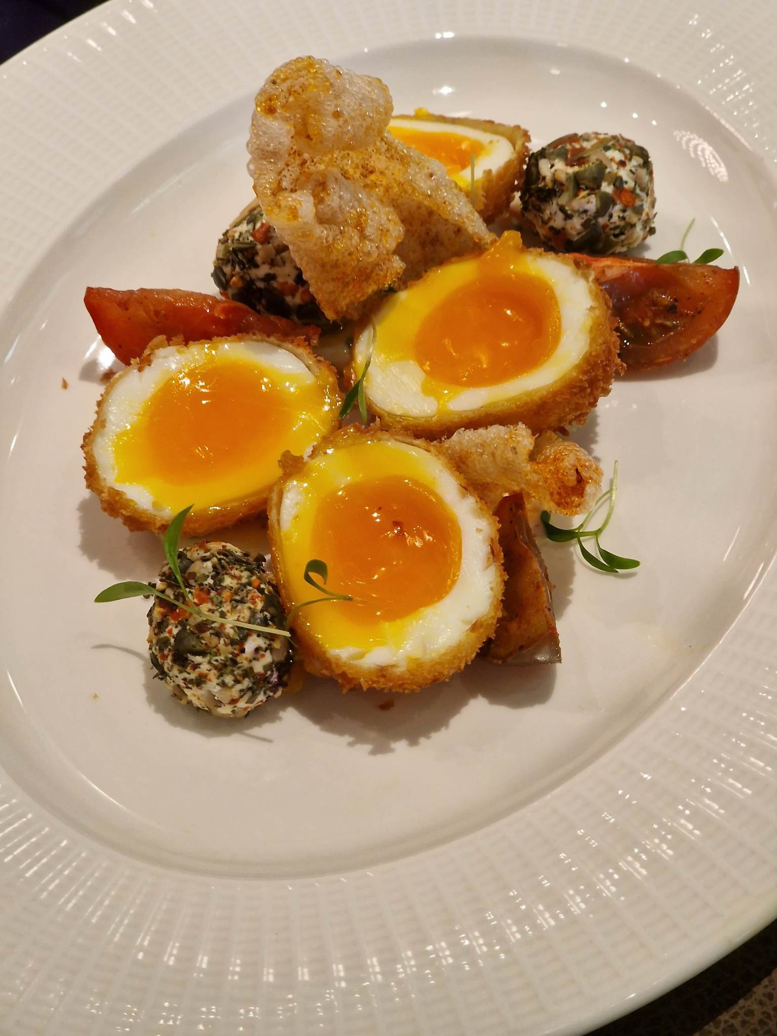 Το ένα, Morning Crunch με δύο βραστά αβγά ελαφρώς τηγανισμένα σε ιαπωνικά crumbs, κατσικίσιο τυρί με ξηρούς καρπούς, ντομάτες, μαγιονέζα μπέικον και tapioca chips. Αυγά βρασμένα όπως και όσο πρέπει, ισορροπημένες γεύσεις με το tapioca να προσδίδει μια ενδιαφέρουσα crunchy νότα και απαραίτητη αναφορά στη μαγιονέζα μπέικον που δένει άρτια με τα υπόλοιπα και εξυψώνει τις γεύσεις.