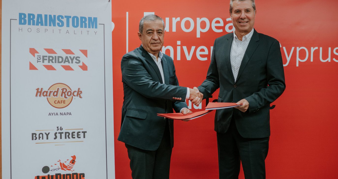 Εκ μέρους του Ευρωπαϊκού Πανεπιστημίου Κύπρου υπέγραψε ο Διευθύνων Σύμβουλος και Πρόεδρος του συμβουλίου του Ευρωπαϊκού Πανεπιστημίου, Δρ. Χριστόφορος Χατζηκυπριανού και εκ μέρους της Brainstorm Hospitality Group, ο Διευθύνων Σύμβουλος και Πρόεδρος του ομίλου, κ. Κρίς Χριστοδούλου. H Brainstorm Hospitality Group εργοδοτεί πέραν των 500 υπαλλήλων και έχει την αποκλειστική διαχείριση των γνωστών Αμερικανικών αλυσίδων εστίασης TGI Fridays, Hard Rock Café και Jailbirds. Στον όμιλο ανήκουν επίσης το 36 Baystreet all-day sports pub και το Yogartist Frozen Yogurt στη Λάρνακα. Σκοπός της συνεργασίας είναι η ανάπτυξη και η αξιοποίηση των σχέσεων των δύο μερών προς αμοιβαίο όφελος τόσο της κοινωνίας όσο και των δυο οργανισμών.