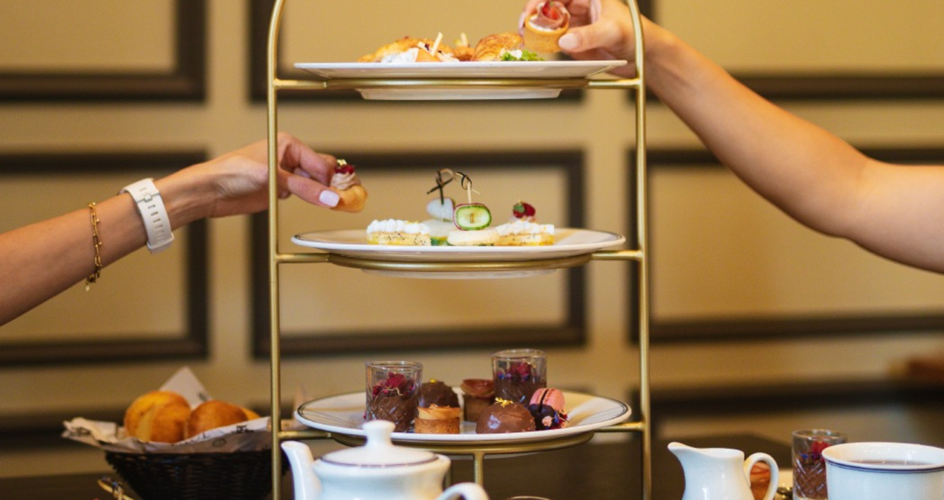 To High Tea μενού, περιλαμβάνει διάφορες γλυκές και αλμυρές νοστιμιές όπως μίνι σάντουιτς και κρουασάν, αλμυρές τάρτες, scones, μακαρόν και πολλά άλλα, ενώ όλα συνοδεύονται με αρωματικό τσάι, καφέ ή σαμπάνια!