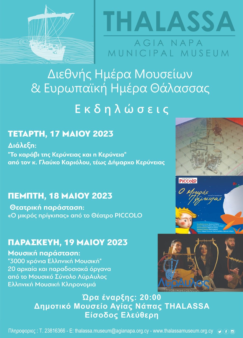Το Δημοτικό Μουσείο Αγίας Νάπας THALASSA την Πέμπτη, 18 Μαΐου 2023, Διεθνή Ημέρα Μουσείων και Ευρωπαϊκή Ημέρα Θάλασσας, θα είναι ανοικτό από τις 09:00 μέχρι τις 21:00 και η είσοδος στους εκθεσιακούς χώρους θα είναι δωρεάν.