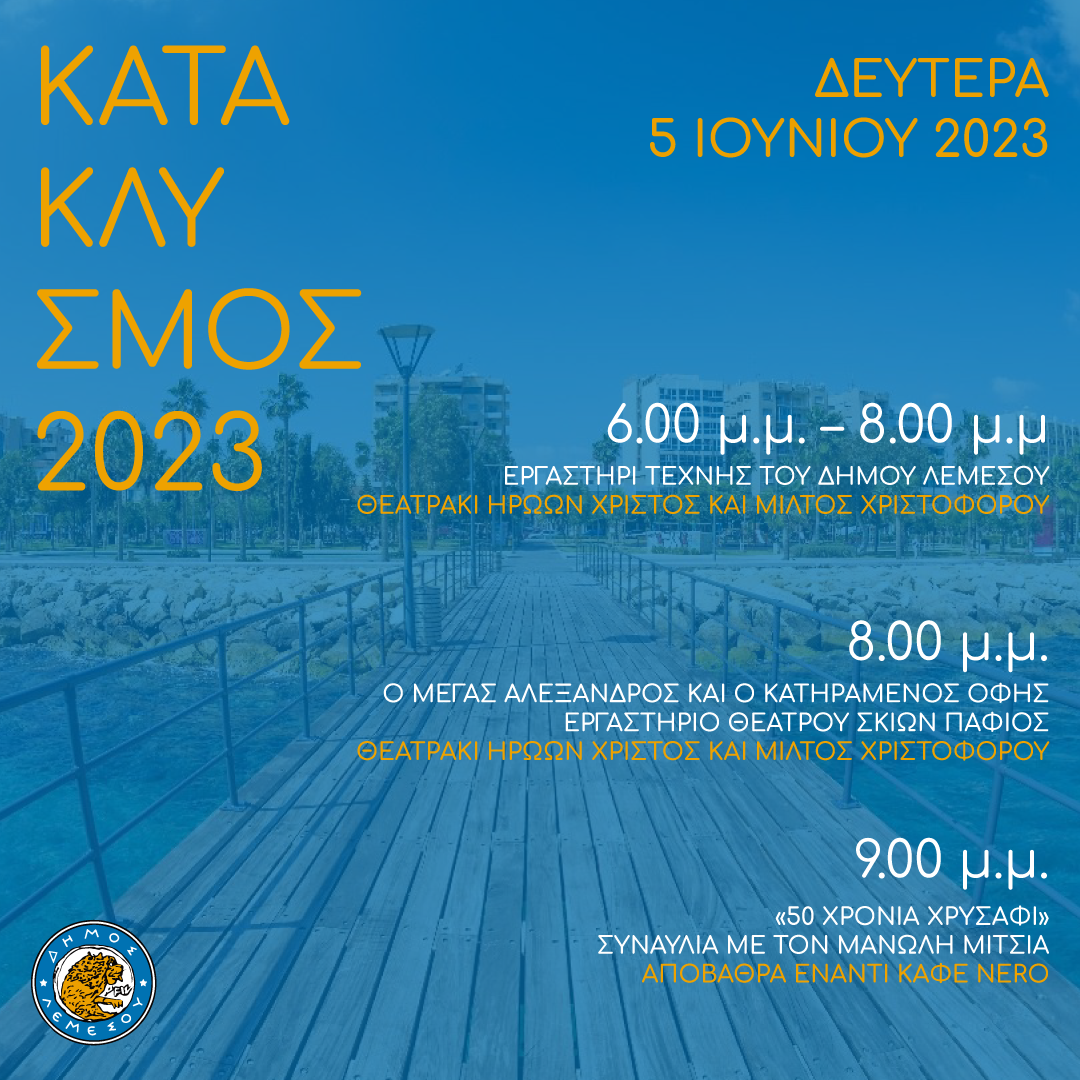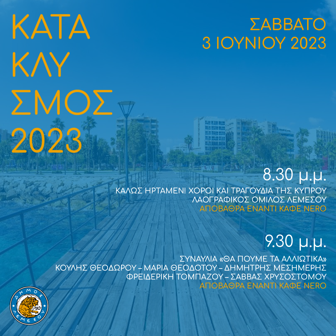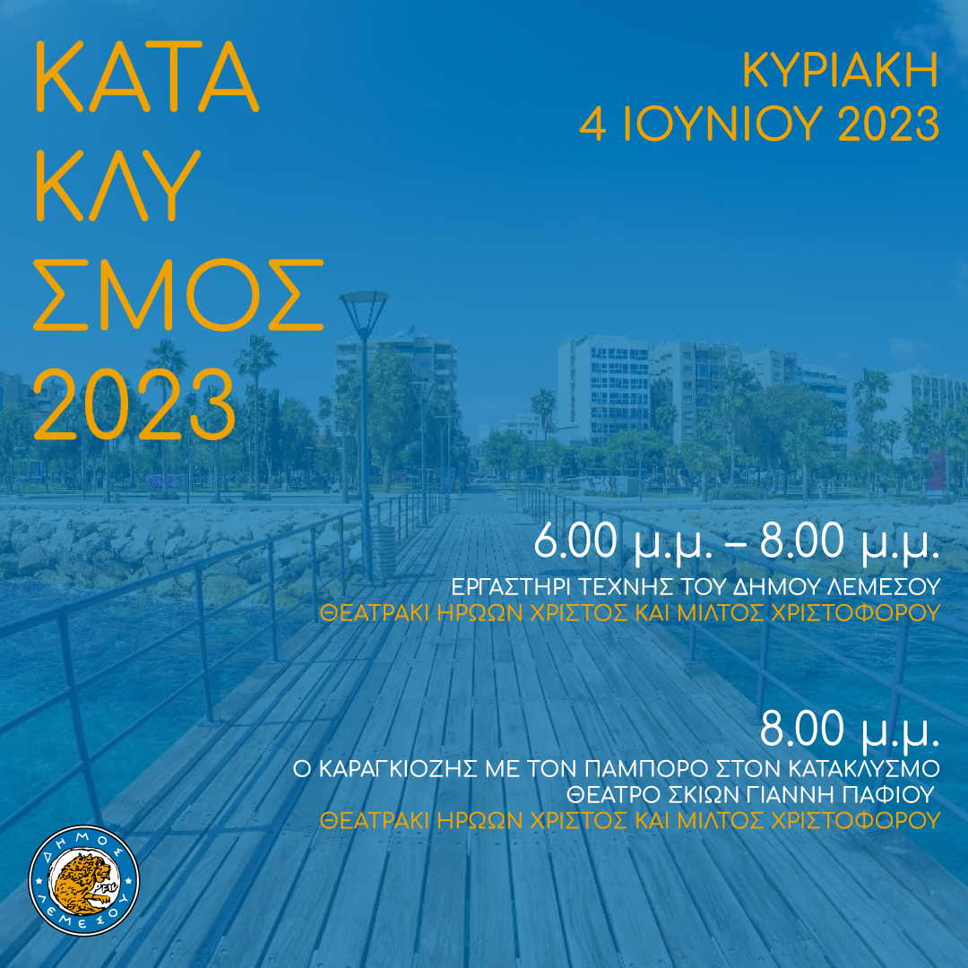 Ο Δήμος Λεμεσού σε προσκαλεί στις εκδηλώσεις του Κατακλυσμού 2023 με πλούσιο καλλιτεχνικό πρόγραμμα για το τριήμερο 3 με 5 Ιουνίου 2023.