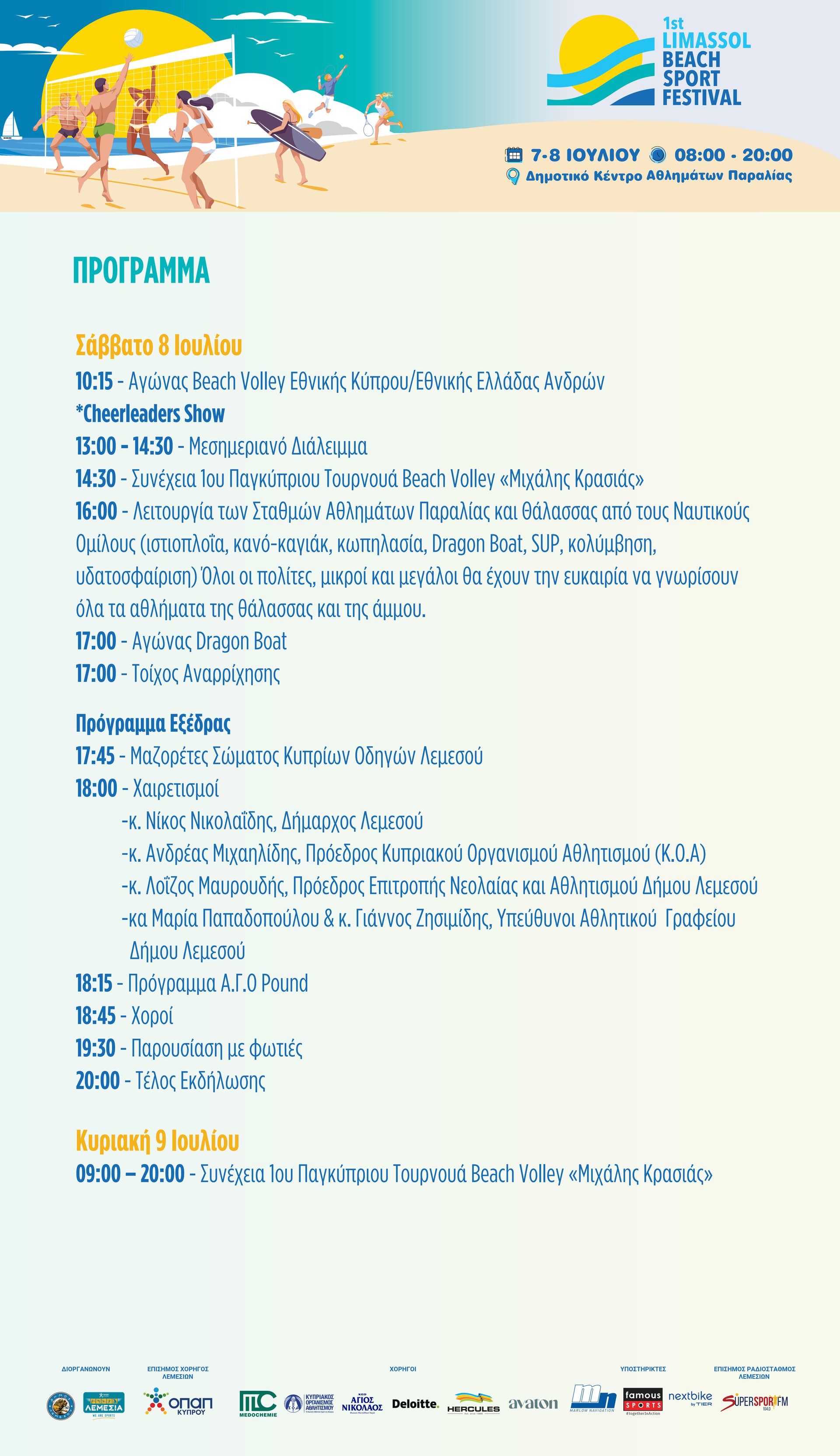Το πιο εντυπωσιακό αθλητικό καλοκαιρινό πάρτι θα πραγματοποιηθεί στις 7 και 8 Ιουλίου 2023 στο Δημοτικό Κέντρο Αθλημάτων Παραλίας (Παραλιακός Λεμεσού https://goo.gl/maps/heMLd2BUkczaSicu5), και εντάσσεται στο πλαίσιο των ΟΠΑΠ Λεμεσίων, της μεγαλύτερης αθλητικής διοργάνωσης της Κύπρου.