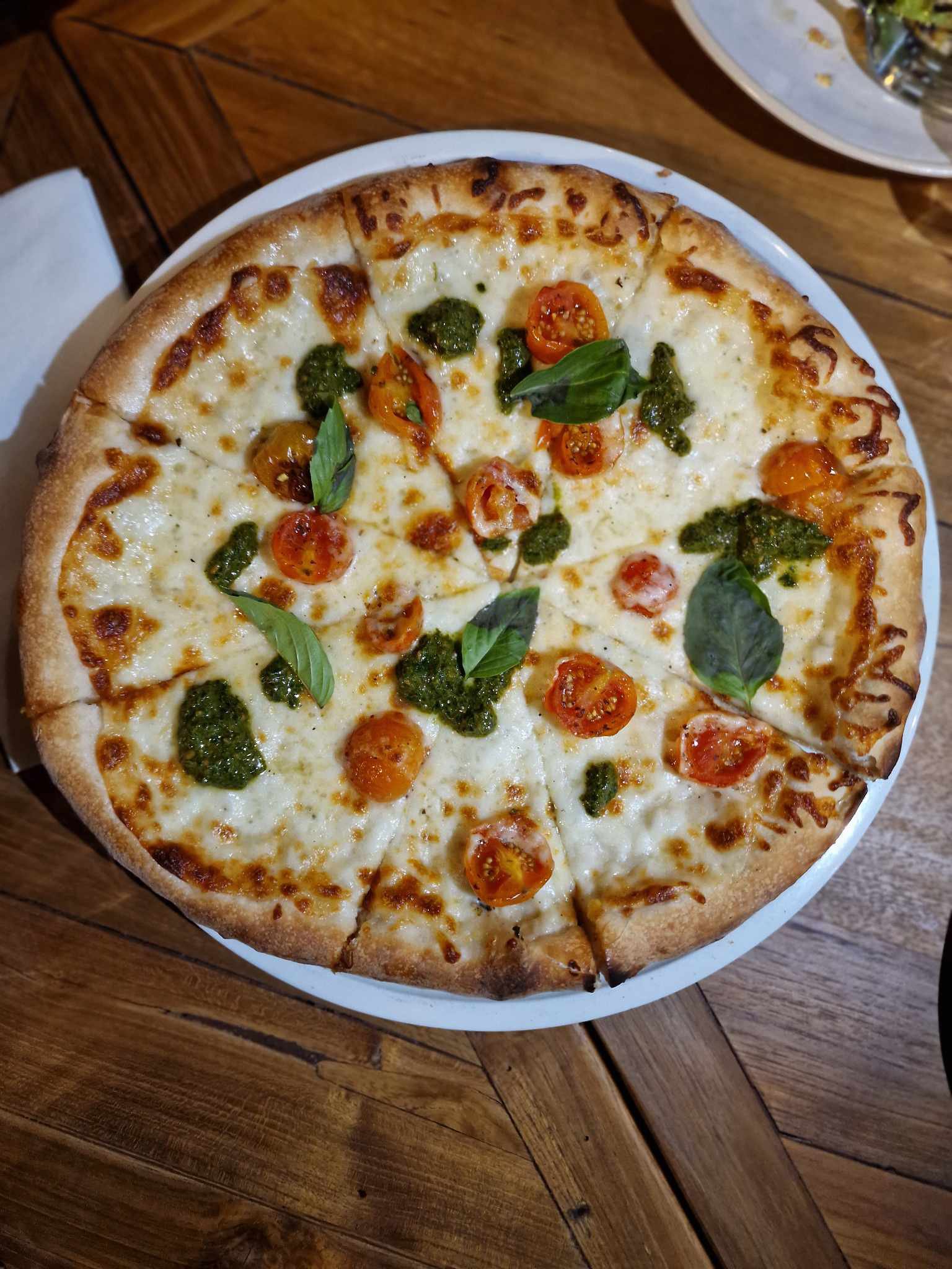 Ακολούθησαν δύο νέες πίτσες, η Tricolore (με μοτσαρέλα, ντομάτα και πέστο) και η La Bianca, από τις οποίες πρωταγωνίστρια ήταν σίγουρα η δεύτερη. Μοτσαρέλλα, fontal, cheddar και παρμεζάνα, ρόκα, γλυκό βαλσάμικο glaze και φιστίκια, δημιουργούν έναν συνδυασμό που ενθουσιάζει τους γευστικούς σου κάλυκες γιατί διαπιστώνεις το πόσο ταιριάζει ένα υλικό σαν το φιστίκι σε μια αχνιστή, ιταλική πίτσα.