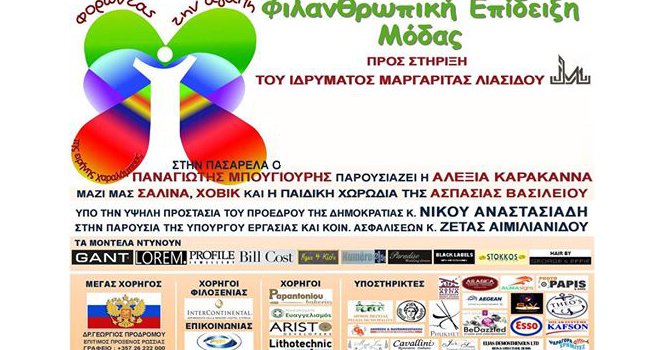 Φιλανθρωπική επίδειξη μόδας πραγματοποιεί το Ίδρυμα Μαργαρίτας Λιασίδου. Για τις ανάγκες της εκδήλωσης, ο δημοφιλής Ελλαδίτης ηθοποιός Παναγιώτης Μπουγιούρης θα αναλάβει ρόλο μοντέλου, ενώ ρόλο παρουσιάστριας θα έχει η Αλεξία Καρακάννα. Τη βραδιά θα ομορφύνουν με τα τραγούδια τους η Σαλίνα, ο Χοβίκ και η παιδική χορωδία της Άσπας Βασιλείου. Η εκδήλωση θα γίνει στην παρουσία της Υπουργού Εργασίας και Κοινωνικών Ασφαλίσεων κ. Ζέτας Αιμιλιανίδου, ενώ τελεί υπό την υψηλή προστασία του Προέδρου της Δημοκρατίας κ. Νίκου Αναστασιάδη. Όλα τα έσοδα θα διατεθούν για τη συνέχιση του κοινωνικού έργου του Ιδρύματος.
