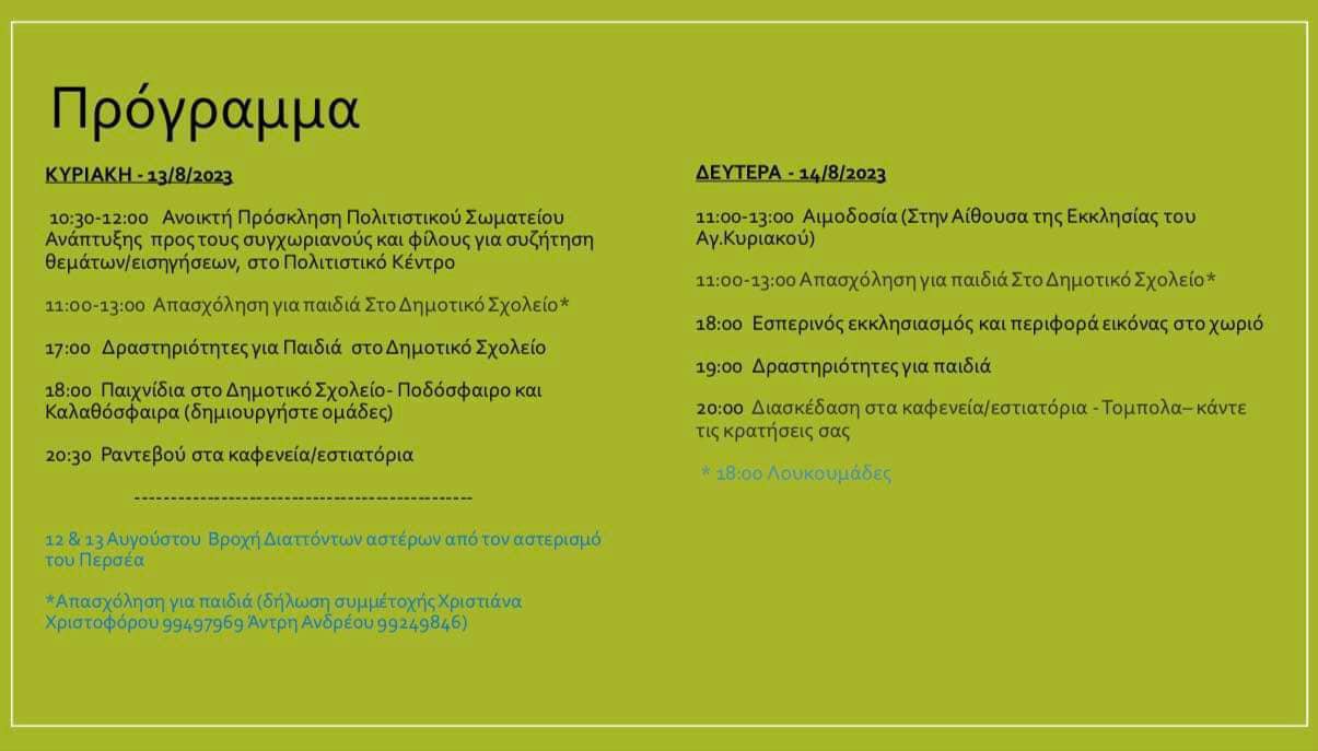 Στο πόγραμμα περιλαμβάνονται μάλιστα δραστηριότητες όπως πρωινό περπάτημα και προετοιμασία παραδοσιακών προϊόντων όπως ρέσι, διασκέδαση στα καφενεία, τόμπολα, μουσικές βραδιές με το μουσικό σχήμα της Βασιλικής Χατζηαδάμου κ.ά.