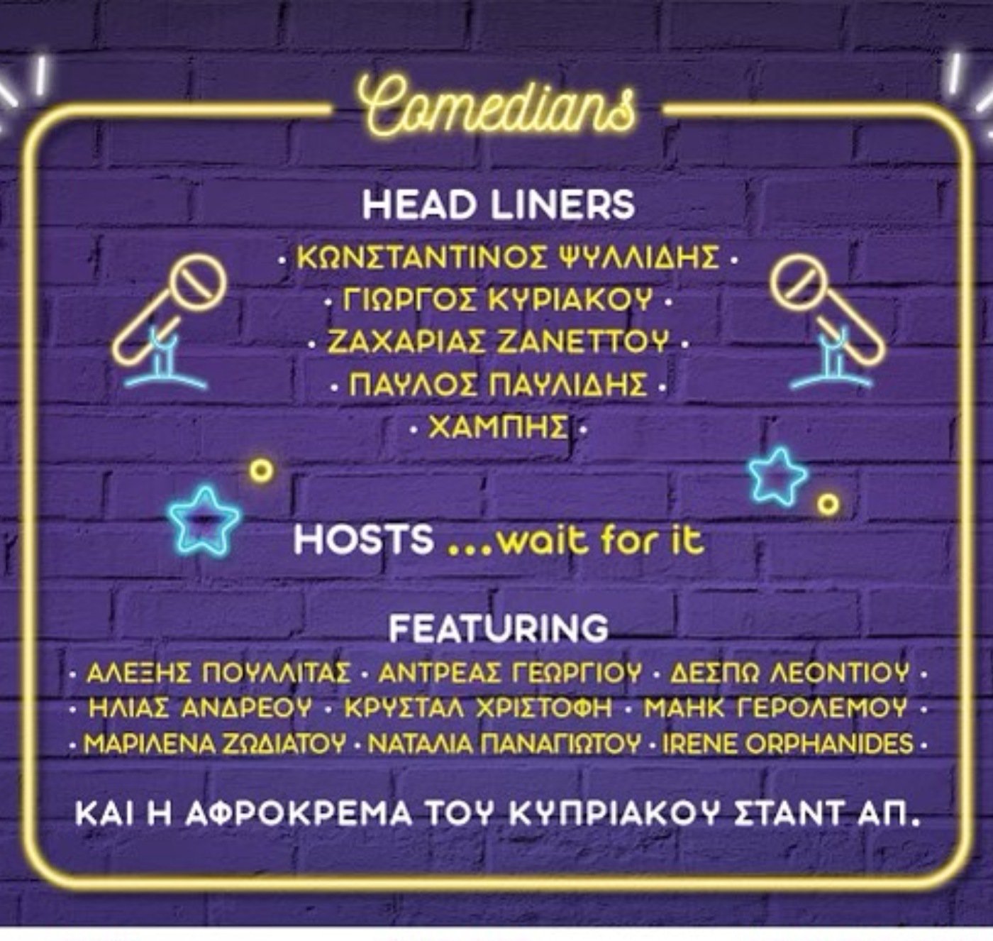 19:00 - 21:00 Στάνταρ Κκόμετυ line up εντός θεάτρου.