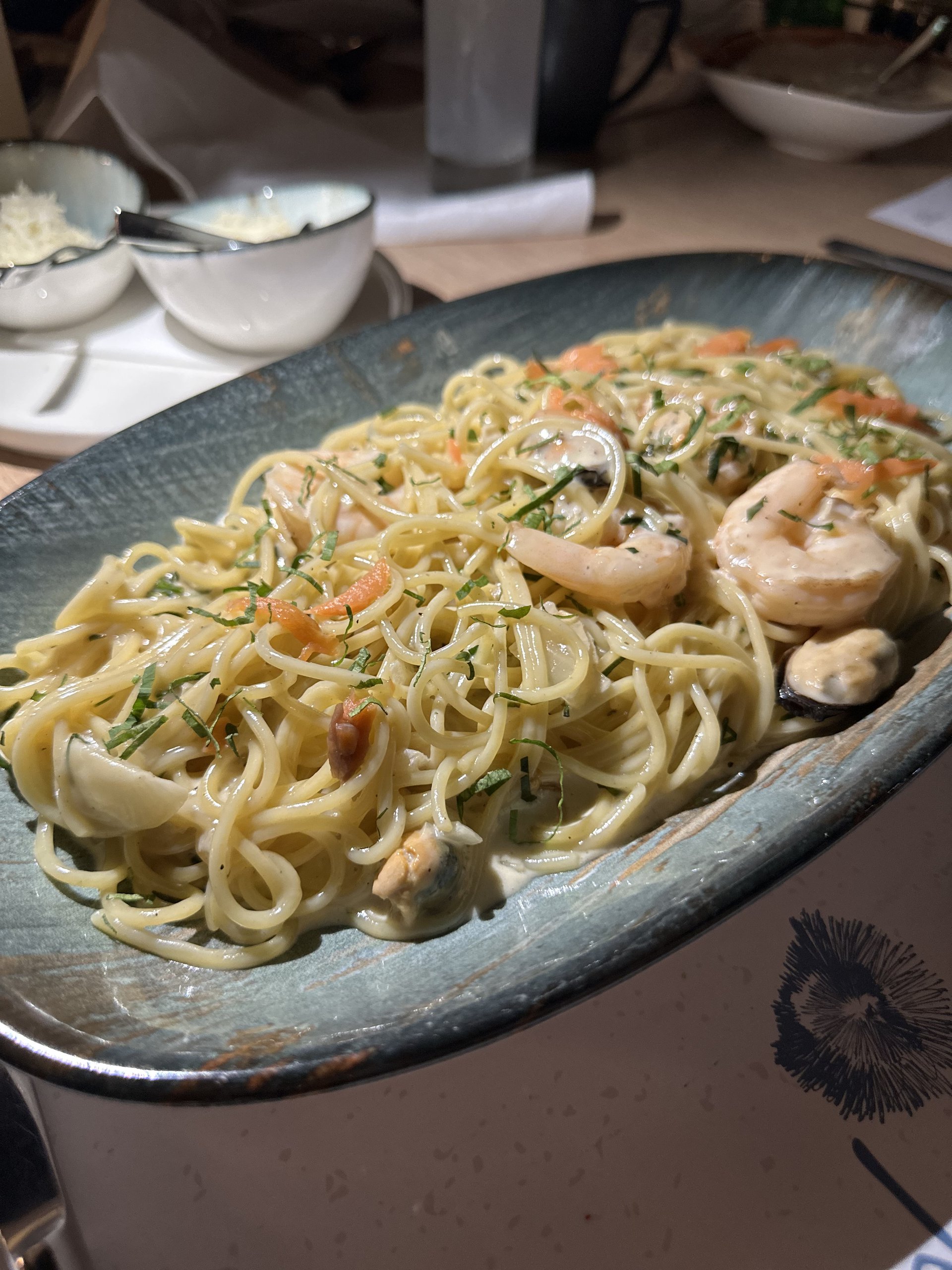 Περνώντας στα κυρίως, δοκιμάσαμε χταπόδι στη σχάρα συνοδευμένο με σπιτική φάβα, τηγανιτό καλαμάρι με πατάτες τηγανίτες και ένα πολύ ωραίο σος ταρτάρε. Συνεχίσαμε με πιάτα ζυμαρικών με την κρεμώδες μακαρονάδα θαλασσινών να μας ενθουσιάζει αλλά και τα ζυμαρικά με μελάνι καλαμαριού και βασιλικές γαρίδες να είναι εξίσου νόστιμα.