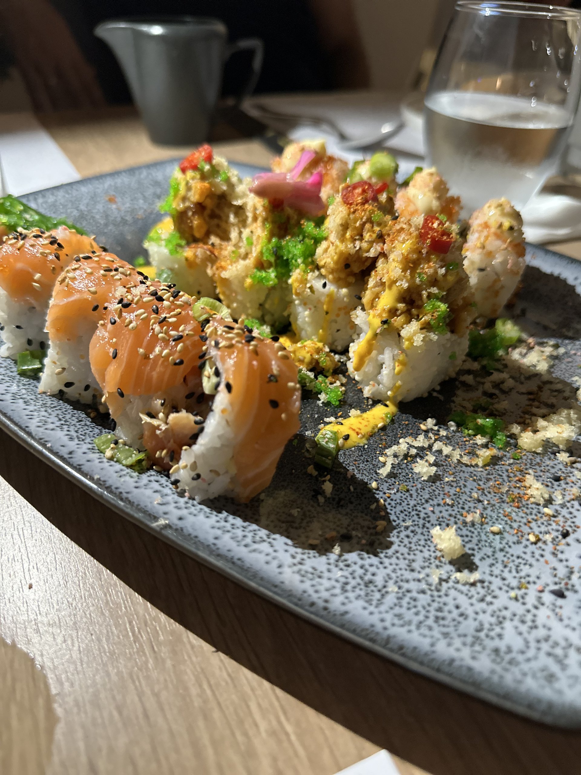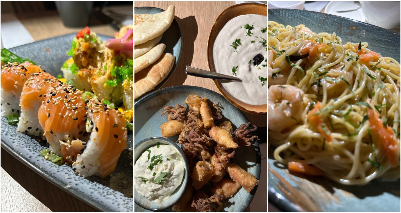 Το μενού έχει ως βάση τις επιλογές σε θαλασσινά, φρέσκα ψάρια και μεζέ, θαλασσινά με ζυμαρικά, sushi ακολουθώντας την tapas / to-share φιλοσοφία. Συμπληρώνεται με κάποια πιάτα κρεατικών όπως μπριζόλες, steak και φιλέτα. Επιλέξαμε να δοκιμάσουμε, για ξεκίνημα, κλασικό και αγαπημένο τηγανιτό καλαμάρι και για ορεκτικό ντιπ ταχίνι και, φυσικά, αφού είμαστε λάτρεις των sushi, συνεχίσαμε με maki rolls. Από την ίδια καρτέλα δοκιμάσαμε επίσης California roll, Philadelphia roll και το dynamite tuna roll με το τελευταίο να αποτελεί ένα από τα ξεκάθαρα highlights.