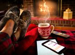 Στολίδια, λαμπιόνια και το τζάκι αναμμένο με μια χριστουγεννιάτικη ταινία να παίζει στην τηλεόραση