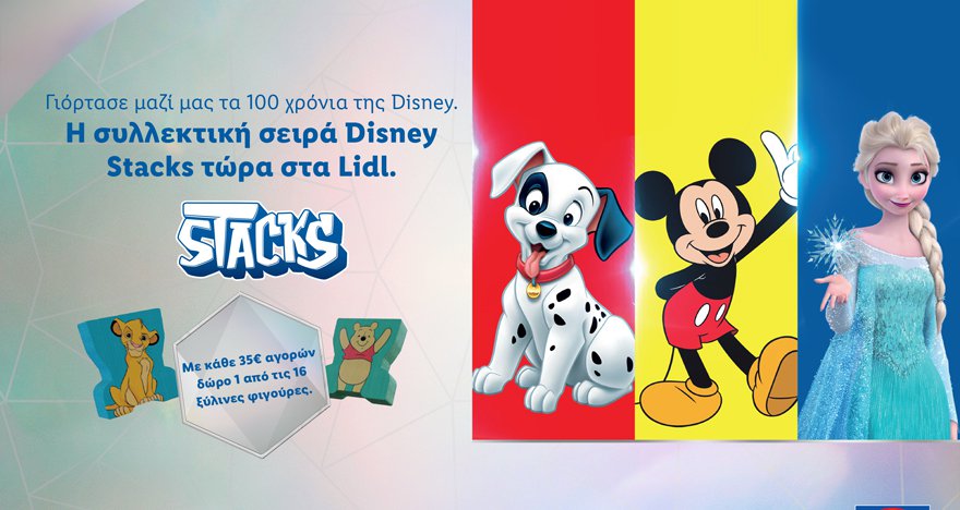 Από την Πέμπτη 05.10.2023 έως και την Τετάρτη 15.11.2023 και μέχρι εξαντλήσεως των αποθεμάτων, με κάθε 35€ αγορών, οι πελάτες των καταστημάτων Lidl μπορούν να αποκτήσουν εντελώς δωρεάν από το ταμείο μία συλλεκτική φιγούρα Disney Stacks. Εκτός από τον Μίκυ Μάους, την Έλσα από το Frozen και τον μικρούλη Πάτσα από τα 101 Σκυλιά της Δαλματίας, υπάρχουν συνολικά 16 φιγούρες, οι οποίες θα συναρπάσουν μικρούς και μεγάλους!