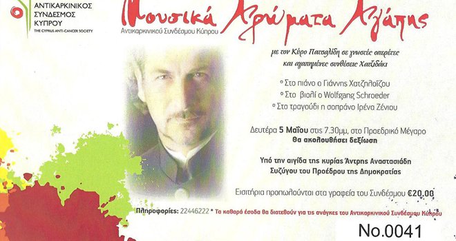 Ο Αντικαρκινικός Σύνδεσμος Κύπρου διοργανώνει φιλανθρωπική βραδιά, με το διεθνούς φήμης βαρύτονο Κύρο Πατσαλίδη, ο οποίος θα ερμηνεύσει γνωστές απερέτες, με τίτλο “Μουσικά Χρώματα Αγάπης”. Στο πιάνο θα είναι ο Γιάννης Χατζηλοϊζου, στο βιολί ο Wolfgang Shroeder και στο τραγούδι η σοπράνο Ιρένα Ζένιου. Το πρόγραμμα της βραδιάς θα είναι ένα μουσικό πέρασμα από επιλεγμένα γνωστά αποσπάσματα από τον κόσμο της όπερας, μέχρι τον Χατζιδάκι. Η εκδήλωση τελεί υπό την αιγίδα της κυρίας Άντρης Αναστασιάδη. Όλα τα καθαρά έσοδα θα διατεθούν για να ενισχύσουν το έργο του Αντικαρκινικού Συνδέσμου.