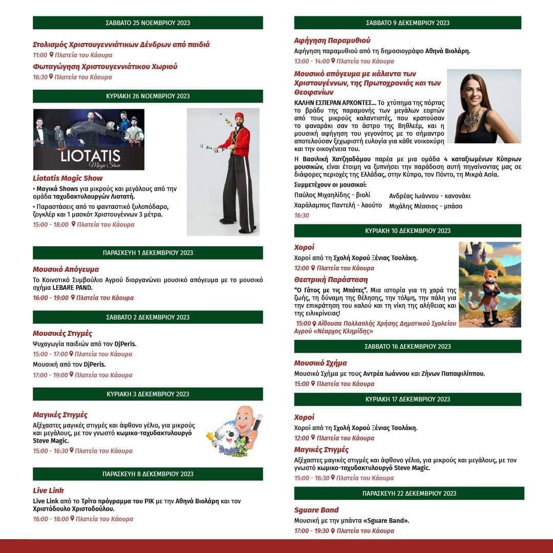 Στις 25 Νοεμβρίου γίνεται η αρχή, με τον στολισμό του δέντρου στην Πλατεία του Κάουρα. Στις μέρες που θα ακολουθήσουν θα μπορούμε να απολαύσουμε magic show, θεατρικές παραστάσεις, χορούς, χειροτεχνίες, μουσικό πρόγραμμα και θα έχουμε αγαπημένες μασκότ στην παρέα μας.