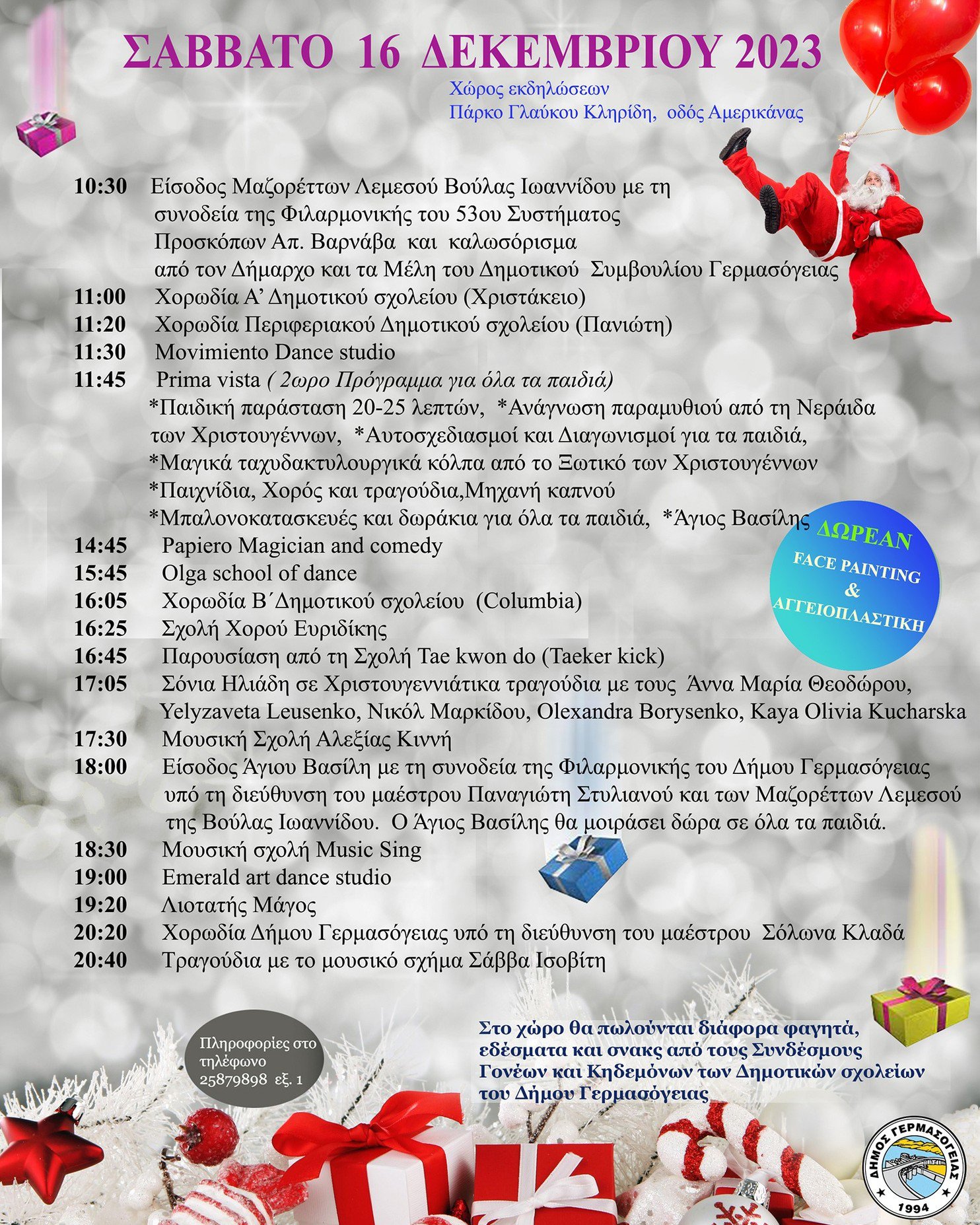 - 18:00 Είσοδος Άγιου Βασίλη με τη συνοδεία της Φιλαρμονικής του Δήμου Γερμασόγειας υπό τη διεύθυνση του μαέστρου Παναγιώτη Στυλιανού και των Μαζορέττων Λεμεσού της Βούλας Ιωαννίδου. Ο Άγιος Βασίλης θα μοιράσει δώρα σε όλα τα παιδιά.