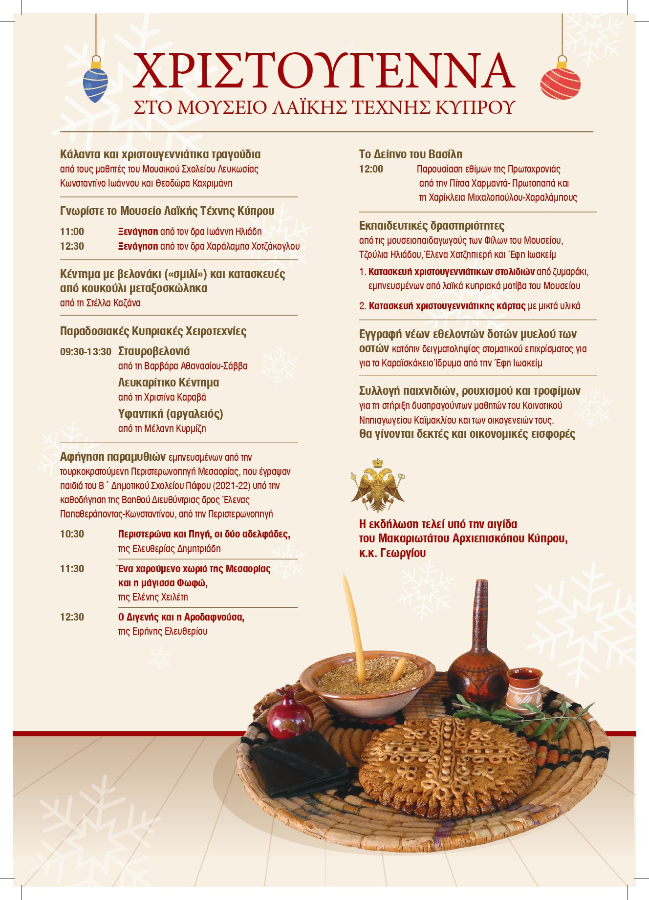 Οι Φίλοι του Μουσείου Λαϊκής Τέχνης Κύπρου και η Εταιρεία Κυπριακών Σπουδών συνδιοργανώνουν με την Ένωση Περιστερωνοπηγιωτών και την Ένωση Εκτοπισμένων Κοινοτήτων Αμμοχώστου την Κυριακή 17 Δεκεμβρίου 2023 από τις 09:30 έως 13:30 Χριστουγεννιάτικη Εκδήλωση με τίτλο Έλα και χάρισε ένα χαμόγελο!