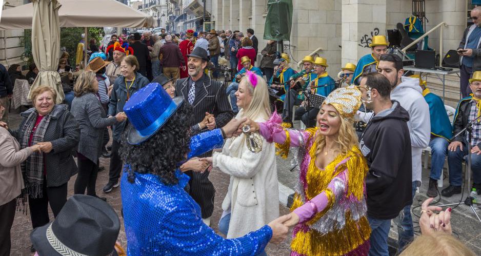 Καρναβαλίστικο ξεφάντωμα με μουσική και κέρασμα μπροστά από την Ελληνική Τράπεζα (οδός Γλάδστωνος) και την Τράπεζα Κύπρου (οδός Αγίου Ανδρέου έναντι εκκλησίας Αγίας Νάπας).