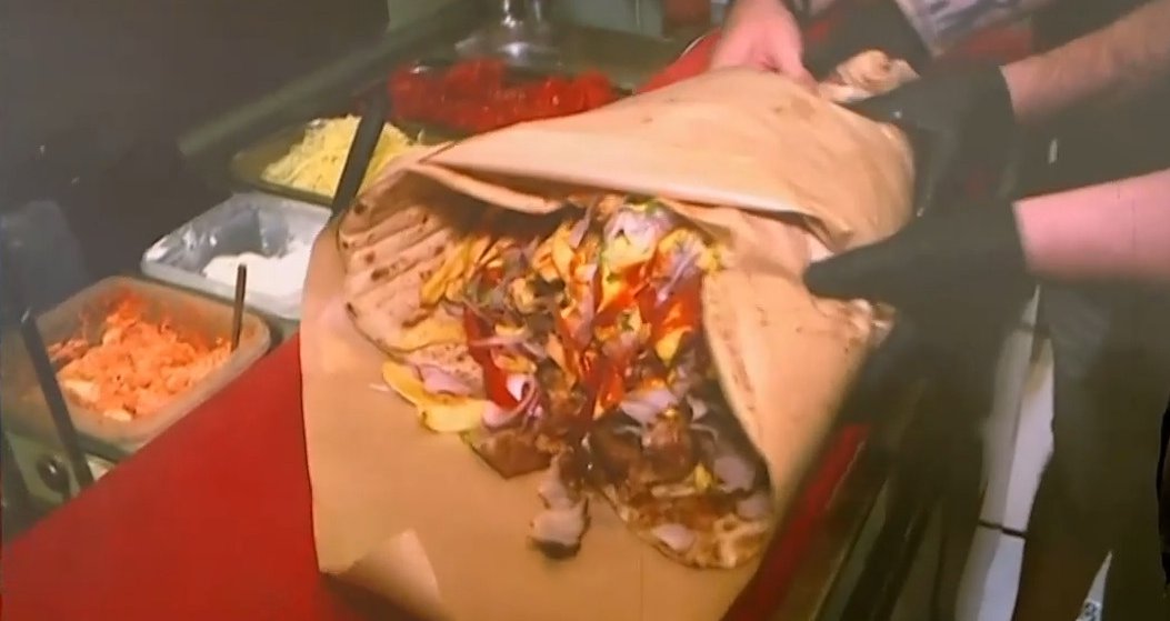 Ο πιτόγυρος – γίγας αποτελείται από τρεις τεράστιες πίτες, γύρο, πατάτες, ντομάτα, κρεμμύδι, κέτσαπ και μουστάρδα