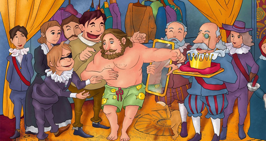 Ο περίγυρος του παλατιού από συμφέρον και φόβο προσποιείται ότι βλέπει τα ρούχα αυτά, έτσι και ο ίδιος ο βασιλιάς παραδέχεται ότι είναι τα πιο εκπληκτικά ρούχα που έχει ποτέ φορέσει... Ποιος τολμηρός μπορεί να του πει άραγε ότι δεν φορά απολύτως τίποτα;