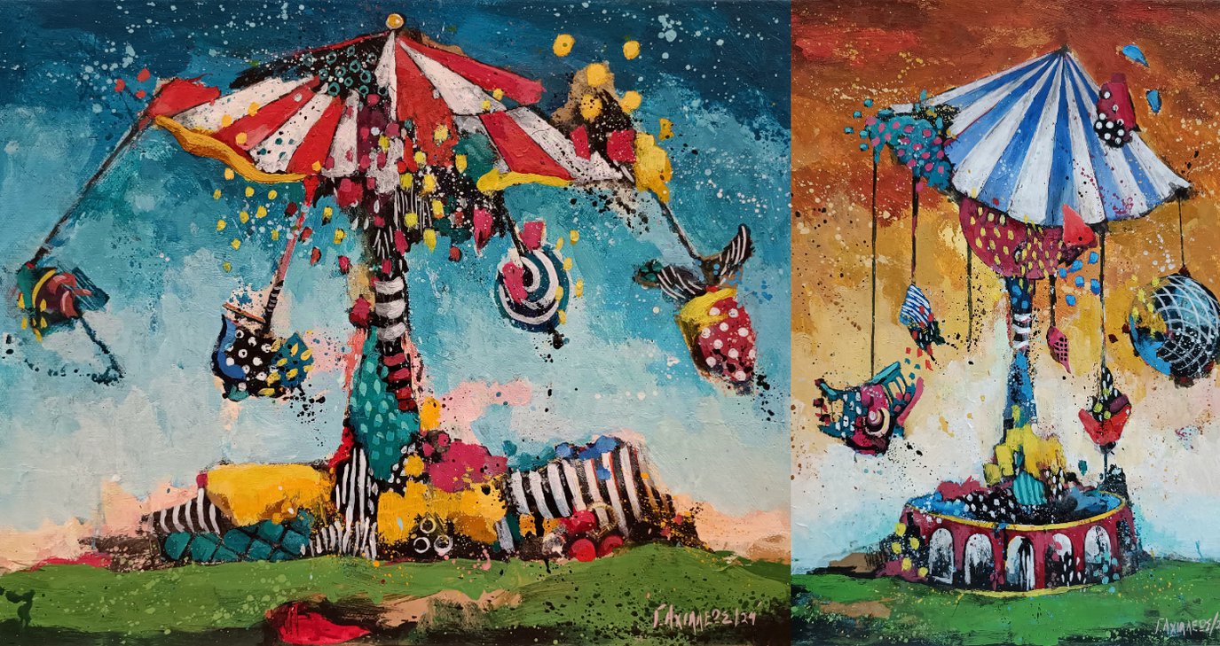 Ο Γιώργος Αχιλλέως στην τέταρτη ατομική του έκθεση προσθέτει ακόμα ένα κεφάλαιο στο σωστικό του παραμύθι. Τα ζωγραφικά του σύμβολα, γειώνονται αυτή τη φορά σε ένα αλλόκοτο, χαρούμενο, νοσταλγικό και συνάμα παιγνιώδες τοπίο. Η έκρηξη χρωμάτων και τα μοτίβα των κολάζ που είναι στοιχεία πλέον γνώριμα στα έργα του καλλιτέχνη «ζωντανεύουν» στην παραμυθένια τοποθεσία της φαντασίας καθώς και τα καρουζέλ και οι ρόδες στο Λούνα παρκ περιστρέφονται προς τέρψη του θεατή. Το καινούριο στοιχείο στην έκθεση αυτή, φαίνεται να είναι η τοποθέτηση των στοιχείων-σχημάτων στο έδαφος αντί στον αέρα χωρίς φυσικά να εξαφανίζεται εντελώς η κίνησή τους. Η προσέγγιση αυτή του Αχιλλέως ίσως προβάλλει εμμέσως την ωρίμανση, και την γείωση που αναπόφευκτα φέρνει ο αδυσώπητος χρόνος σε ανθρώπους και συναισθήματα.