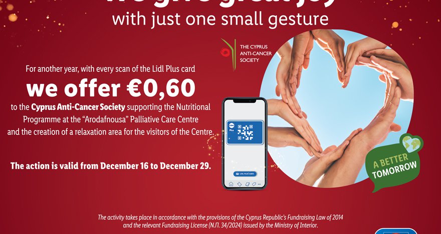Η Lidl Κύπρου, θέτοντας στο επίκεντρο τον συνάνθρωπο παραμένει σταθερή στην ενίσχυση της ασπίδας της αλληλεγγύης και αυτά τα Χριστούγεννα δίνει μεγάλη χαρά με μία μικρή κίνηση σε όσους το έχουν ανάγκη. Από τη Δευτέρα 16 μέχρι και την Κυριακή 29 Δεκεμβρίου, με κάθε σκανάρισμα της ψηφιακής κάρτας Lidl Plus, η εταιρεία προσφέρει 0,60€ στον Αντικαρκινικό Σύνδεσμο Κύπρου, στηρίζοντας το Επισιτιστικό Πρόγραμμα του Κέντρου Ανακουφιστικής Φροντίδας «Αροδαφνούσα» και τη δημιουργία ενός χώρου ξεκούρασης για τους επισκέπτες του Κέντρου.