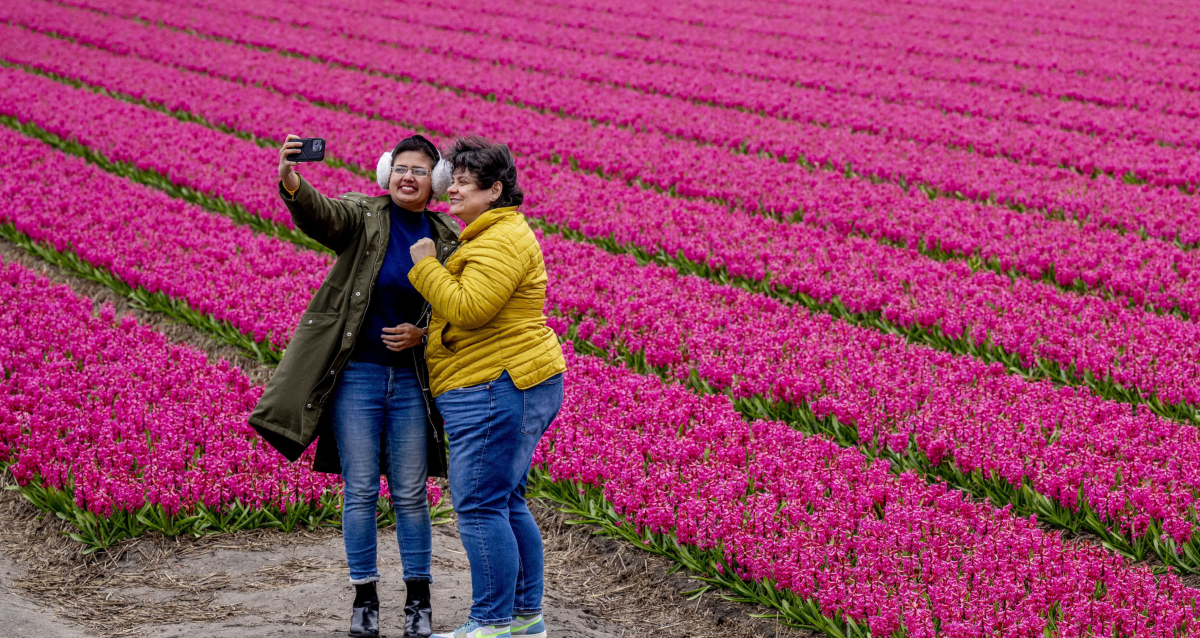 Μια ηλιόλουστη ημέρα στο Keukenhof, τα χρώματα των λουλουδιών δημιουργούν ένα μοναδικό φόντο για τη selfie των επισκεπτών.
