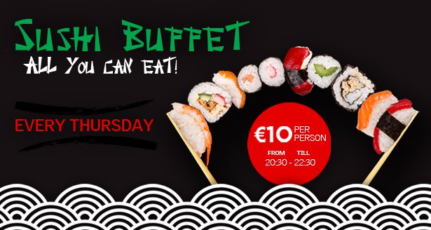 Αν, λοιπόν, σας αρέσουν τα sushi, τότε μην ξεχνάτε ότι κάθε Πέμπτη βράδυ μπορείτε να απολαύσετε όσα θέλετε από ένα πλούσιο μπουφέ με μόνο €10 το άτομο.