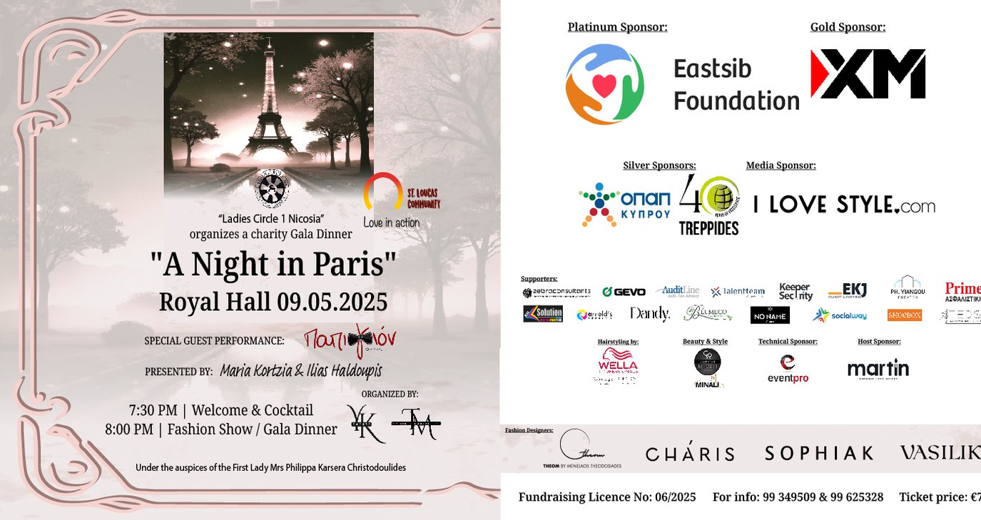 Την Παρασκευή 9 Μαΐου στηρίζουμε το εξαιρετικό έργο της Κοινότητας του Αγίου Λουκά του Ιατρού. Το Συμβούλιο και τα μέλη του σωματείου Ladies Circle 1 Λευκωσίας έχουν την τιμή να σας προσκαλέσουν στην ξεχωριστή φιλανθρωπική εκδήλωση A Night in Paris, η οποία θα πραγματοποιηθεί την Παρασκευή, 9 Μαΐου 2025, στο Royal Hall στις 19:30, υπό την αιγίδα της Πρώτης Κυρίας, κας Φιλίππας Καρσερά Χριστοδουλίδη.