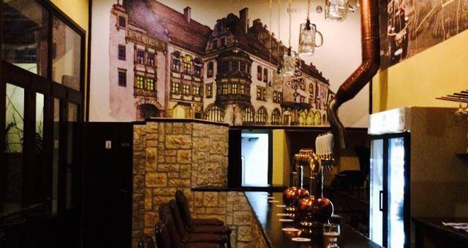 Κυριαρχούν οι αποχρώσεις γαλάζιου και λευκού, στα χρώματα της σημαίας της Βαυαρίας, ενώ τους τοίχους "ντύνουν" παραστάσεις από το Μόναχο, με την εικόνα της Ηofbrauhaus, της μεγαλύτερης μπιραρίας στον κόσμο, να στέκει επιβλητικά πάνω από το μπαρ. Τόσο το Ηofbrauhaus, που άνοιξε τις πύλες του το 1589, όσο και η μπίρα ΗΒ, ανήκουν στο Δήμο του Μονάχου.