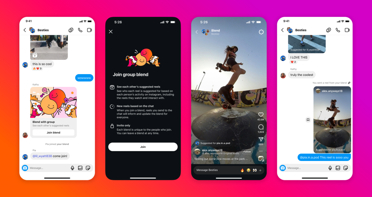 Η νέα αυτή λειτουργία δίνει τη δυνατότητα στους χρήστες να προσκαλέσουν έναν φίλο ή μια ομαδική συνομιλία για να δημιουργήσουν ένα Blend. Μόλις γίνει αποδεκτό, το Instagram εμφανίζει μια προσαρμοσμένη ροή Reels που αποτελείται από προτάσεις για τα άτομα της ομάδας. Μπορεί επίσης να δημιουργηθεί για μια συζήτηση μεταξύ δύο.