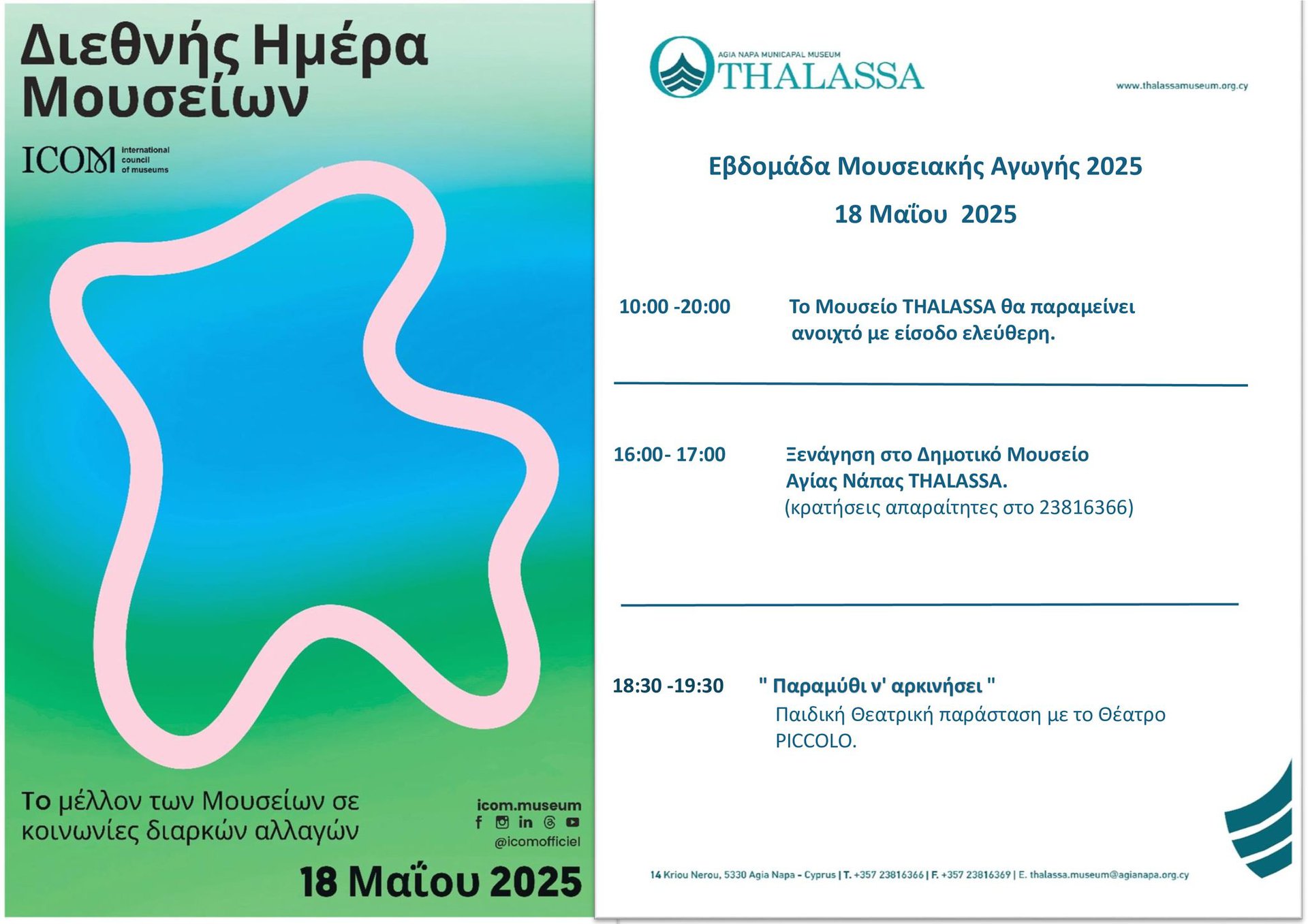 Το Δημοτικό Μουσείο Αγίας Νάπας THALASSA συμμετέχει ενεργά στον εορτασμό της Διεθνούς Ημέρας Μουσείων 2025, που φετος έχει θέμα: «Μουσεία και κοινωνίες σε διαρκή αλλαγή».