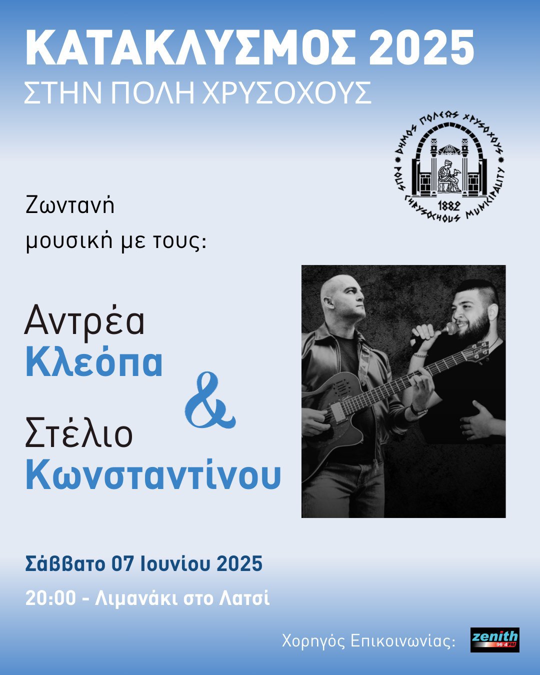 Το Σάββατο 7 Ιουνίου, ο Στέλιος Κωνσταντίνου και ο Αντρέας Κλεόπα δίνουν το έναυσμα στο Λιμανάκι στο Λατσί για ένα όμορφο μουσικό βράδυ, με τραγούδια και καλοκαιρινή διάθεση.