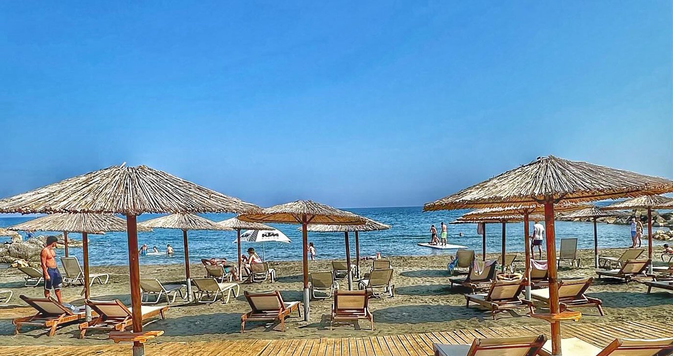 Εδώ λοιπόν θα βρεις ξαπλώστρες και ομπρέλες για να αράξεις (μόνο 5€ το σετ), ξαπλώστρες τύπου καναπέ με VIP θέα στη θάλασσα, ,πανιέρα για ντους και χώρο για αλλαγή ρούχων — χωρίς έξτρα χρέωση.