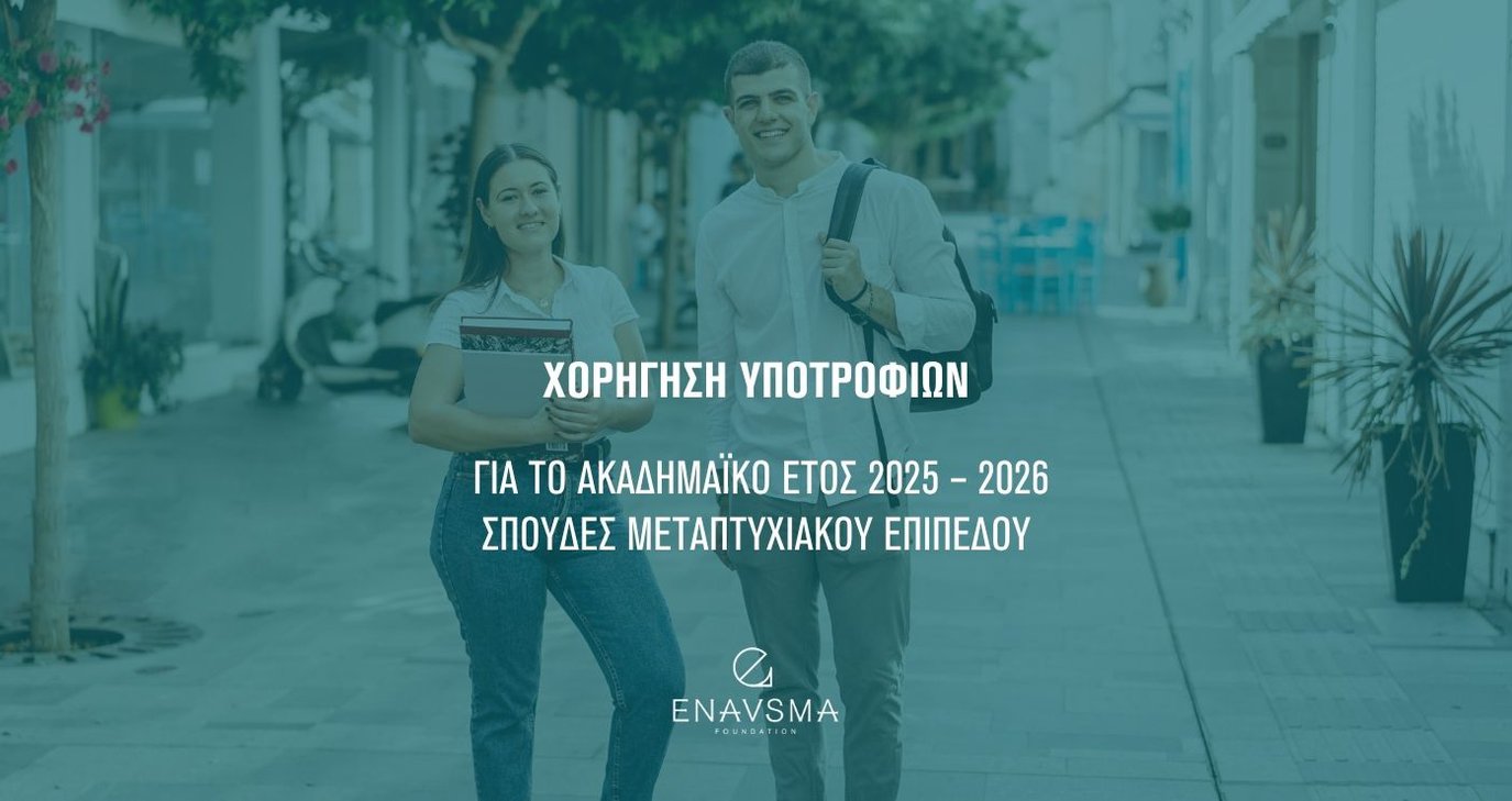 Μέχρι και τις 20 Ιουλίου 2025 θα γίνονται δεκτές οι αιτήσεις για χορήγηση υποτροφιών για σπουδές μεταπτυχιακού επιπέδου (μάστερ), πλήρους φοίτησης στην Κύπρο ή στο εξωτερικό, από το ENAVSMA Foundation, για το ακαδημαϊκό έτος 2025 – 2026. Οι αιτήσεις θα πρέπει να υποβάλλονται ηλεκτρονικά στη διεύθυνση www.enavsma.com.