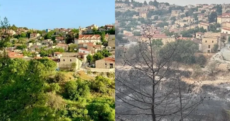 Ο πρώην κοινοτάρχης του χωριού Νίκος Σπύρου, δημοσίευσε εικόνα του χωριού πριν την καταστροφική πυρκαγιά και το μαύρο τοπίο που άφησε πίσω της.