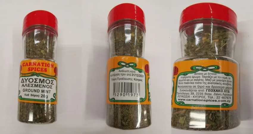 Σύμφωνα με ανακοίνωσή τους, έχουν ενημερώσει την εταιρεία που διανέμει τον αλεσμένο δυόσμο (GROUND MINT), με εμπορική επωνυμία: «ΓΕΟΧΑΚΟ», χρονική ένδειξη ανάλωσης: 31/12/2028, καθαρό βάρος: 20g και χώρα προέλευσης την Κύπρο, ότι περιέχει το αλλεργιογόνο συστατικό σέλινο, χωρίς αυτό να αναγράφεται στη σήμανσή του, με οδηγίες για άμεση απόσυρσή/ανάκλησή του.