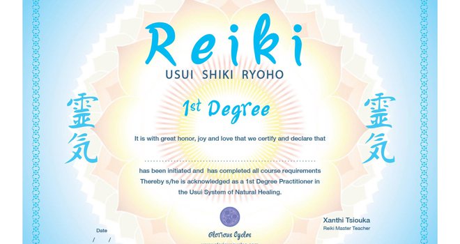 • Πιστοποιητικό Ρέικι 1ου Βαθμού αναγνωρισμένο από τον Πανελλήνιο Σύλλογο Ρέικι και τον Παγκύπριο Συνδεσμο Ολιστικής Υγείας.
