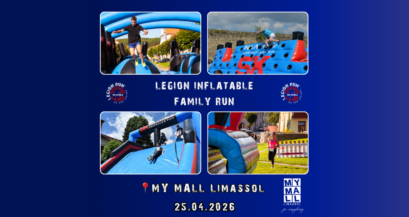 Το My Mall Limassol, ως premium χορηγός, φιλοξενεί το Legion Inflatable Family Run το Σάββατο 25 Απριλίου 2026, από τις 10:00 μέχρι τις 13:00, στον εξωτερικό του χώρο, προσκαλώντας μικρούς και μεγάλους σε μια ξεχωριστή ημέρα γεμάτη δράση, διασκέδαση και οικογενειακές στιγμές.