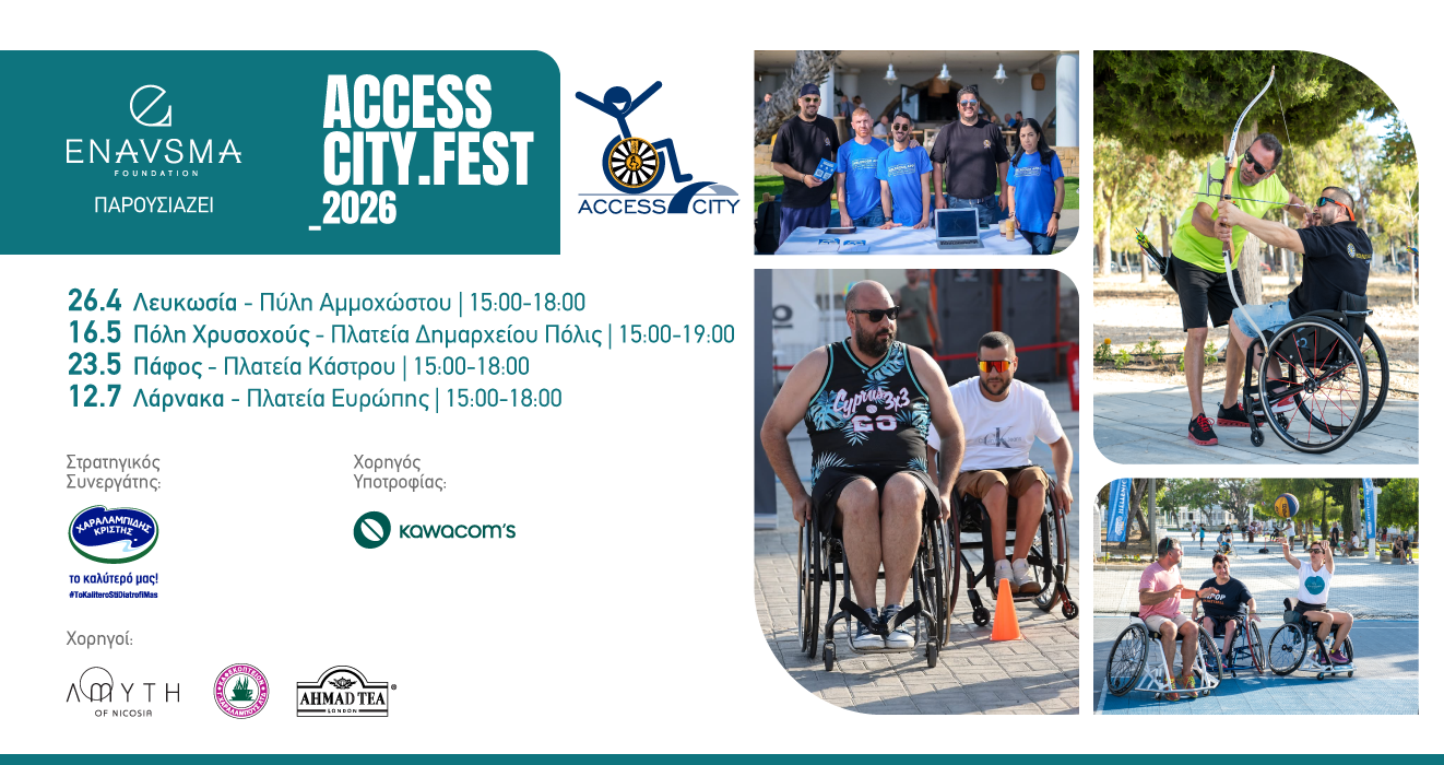 Το Access City Festival 2026 επιστρέφει δυναμικά και διευρύνεται, ταξιδεύοντας σε διάφορες πόλεις της Κύπρου, από το Enavsma Foundation. Μετά την επιτυχημένη συνδιοργάνωση των προηγούμενων ετών με το Round Table 7 Πάφου, το φεστιβάλ εξελίσσεται και μετατρέπει κεντρικά σημεία των πόλεων, από τη Λευκωσία και την Πόλη Χρυσοχούς μέχρι την Πάφο και τη Λάρνακα, σε ανοικτά εργαστήρια βιωματικών δράσεων και παραθλημάτων. Με τη συμβολή του Enavsma Foundation και τη συνεργασία δημοτικών αρχών, τοπικών φορέων και οργανισμών, κάθε στάση του φεστιβάλ προσφέρει μια ολοκληρωμένη εμπειρία συμπερίληψης, ενισχύοντας την κατανόηση και την αποδοχή μέσα από τη συμμετοχή.