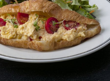 Ένα λαχταριστό, χορταστικό κρουασάν με αλμυρή γέμιση απόscrambled eggs