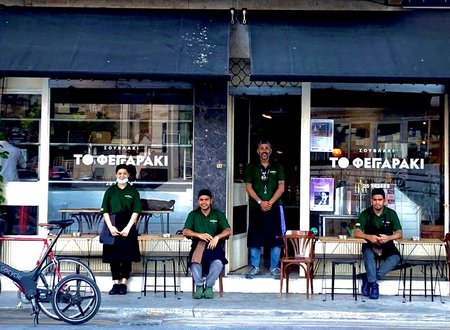 Πιάνουμε τραπεζάκι στονπροσεγμένοχώρο του, και παραγγέλνουμε παραδοσιακά ή «πειραγμένα» σουβλάκια, σε καλές τιμές.