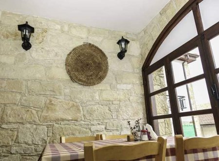 Ένα γωνιακό εστιατόριο στο χωριό Άρσος που στο εσωτερικό του κυριαρχούν η πέτρα και το ξύλο